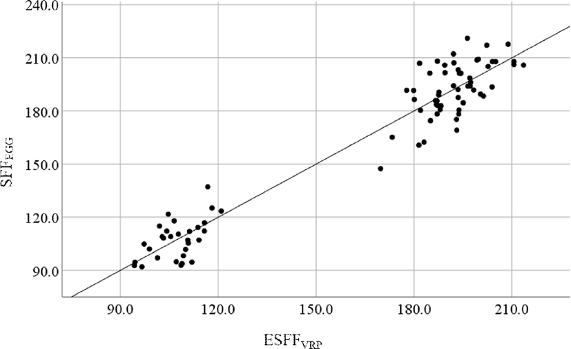 SFFEGG와 VRP(Pearson’s r=.873, p<.001, 그림 1), SRP(Pearson’s r=.932, p<.001, 그림 2)를 통해 예측된 ESFF와 사이에는 공통적으로 강한 양의 상관관계가 있었다.