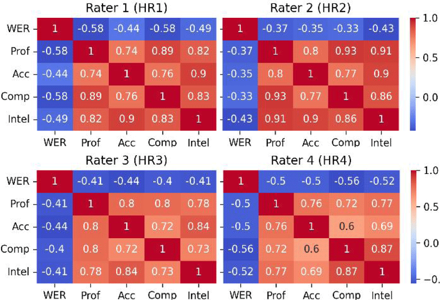 Proficiency and intelligibility have the strongest correlation across all raters, with individual variations noted. For example, HR2 and HR4, show the highest correlations between proficiency- comprehensibility and comprehensibility-intelligibility. These patterns contrast with the WER result from the ASR, suggesting that automated systems may not align with individual rater biases, possibly accounting for the low Cohen’s kappa among the raters. This interpretation, while not definitive, calls for further investigation.